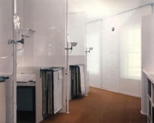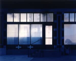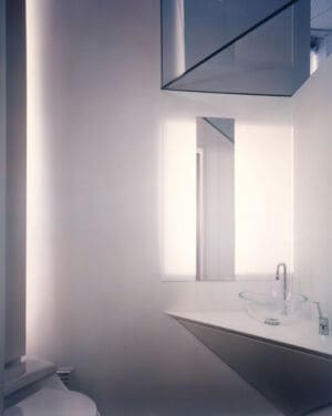 A lighted “slit” panel in the men’s toilet, visible through the clerestory glass.
