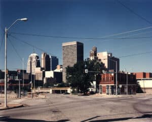 most were lost in mid-20th century when construction of the adjacent interstate I-235 took out much of the Deep Deuce neighborhood. The last historic flatiron to fall was a large laundry operation just across Harrison Avenue.