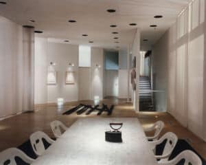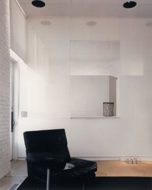 The triangular reception space is formed by theater scrim “holding” the shadows from exterior windows and the light “captured” inside.