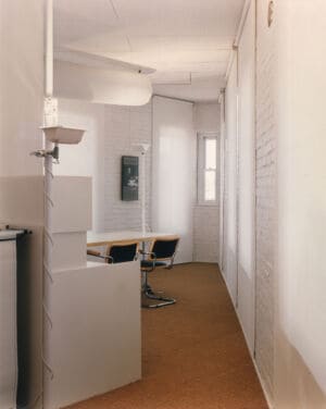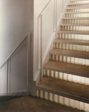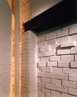 A gallery/conference space on the first level accommodates meetings, small social gatherings, the display of project photographs and changing artwork. Historic charm abounds in stairways of tall walls of exposed brick, stamped with their foundry, Kenyon Brick & Tile Co.