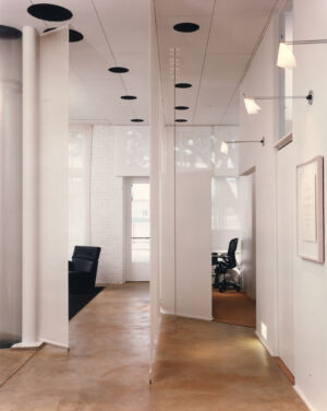 • Theatrical scrim used as a space divider instead of glass. It was necessary to use “zoned sound” to create acoustical privacy between spaces.