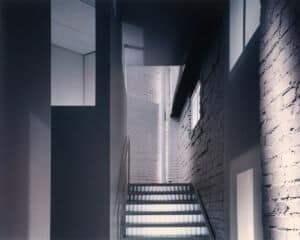 A back-lighted roof drainpipe illuminates the acute-angle corner of the interior brick.