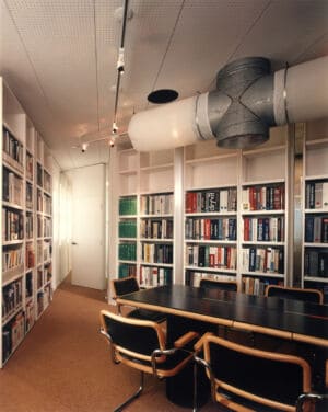 • Perforated hardboard ceilings with batt insulation above acts as an acoustical surface. The diagonal alignment reveals joints for the structural framing above.