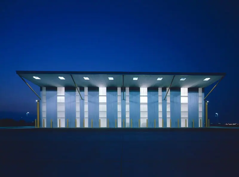 The client had a rudimentary budget to build a structure for storage of snow removal equipment: functional, durable, economical. Its unexpected beauty was an exercise in proportion and scale and an uplifting allusion to flight. Bollards, reflective corrugated metal panels, translucent fiberglass wall panels and huge garage doors are cast in a crisp industrial palette.