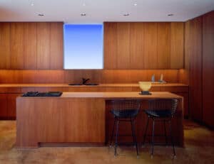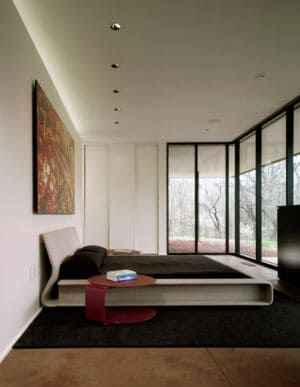 The floorplan provides personal “moments in time”: views of a natural landscape and glimpses of wildlife from the bathtub or the glass shower. An unexpected rainy-day delight is the sight of a waterfall plunging into the lap pool — a sheet of water that you can view from indoors or step outside and stand under.