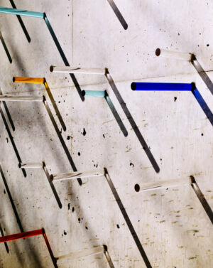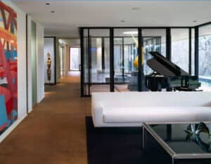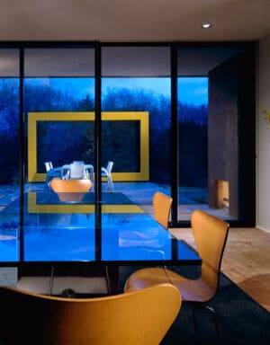 At the front door, a freestanding concrete wall with acrylic rods in an changeable array of colors offers an ever-changing arrival point. The rear door features a 20 x 9-foot yellow steel frame that captures and extends visual fragments beyond the glass.