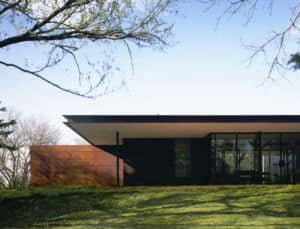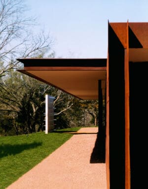 Horizontal bands of rusting steel suggest the earth strata and repeat the red color of the soil. The thin roof cantilevers eight feet to create pedestrian protection and sun control for all seasons.