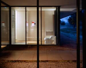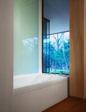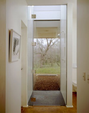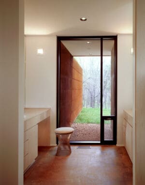 To blur the boundaries between indoor and outdoor spaces, or “bring the outside in,” the home is wrapped in glass. Glass serves as seamless barrier to the natural world, whether the vantage point is the shower, toilet, tub, or kitchen. It’s like living outdoors in a secluded corner of the world.