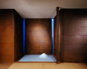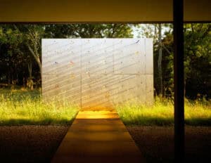 Arriving home by car, the owners are greeted by three striking 6’ x 6’ photographs. (The client loved the idea that even the garage is an art gallery.) A final installation on the north provides an unexpected, pocket-sized Zen Garden made from recycled glass: It’s another “moment” created to offer peace and tranquility.