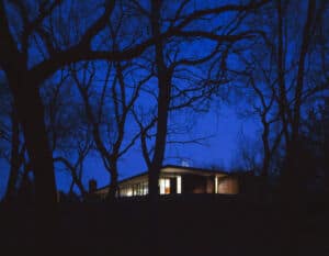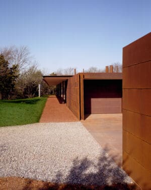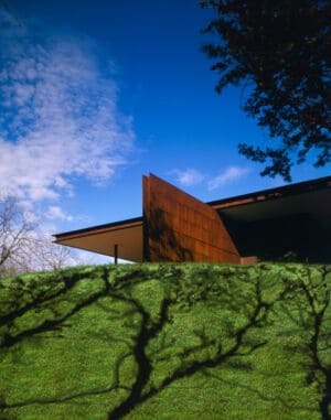 Situated on a natural land ridge, the home appears to rise from the site, like a rectangular cut was made in the earth and it was pushed up from below. Red granite gravel under a roof edge and a rust-colored roof support the concept; the rusted steel roof vents suggest natural grass growing through from the ground below.