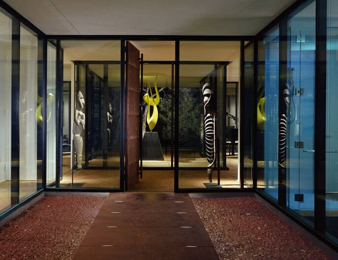 The client’s art collection has been arranged to complement the home’s scale and natural light, while the landscape and weather conditions, seen through glass, are an art experience in themselves.