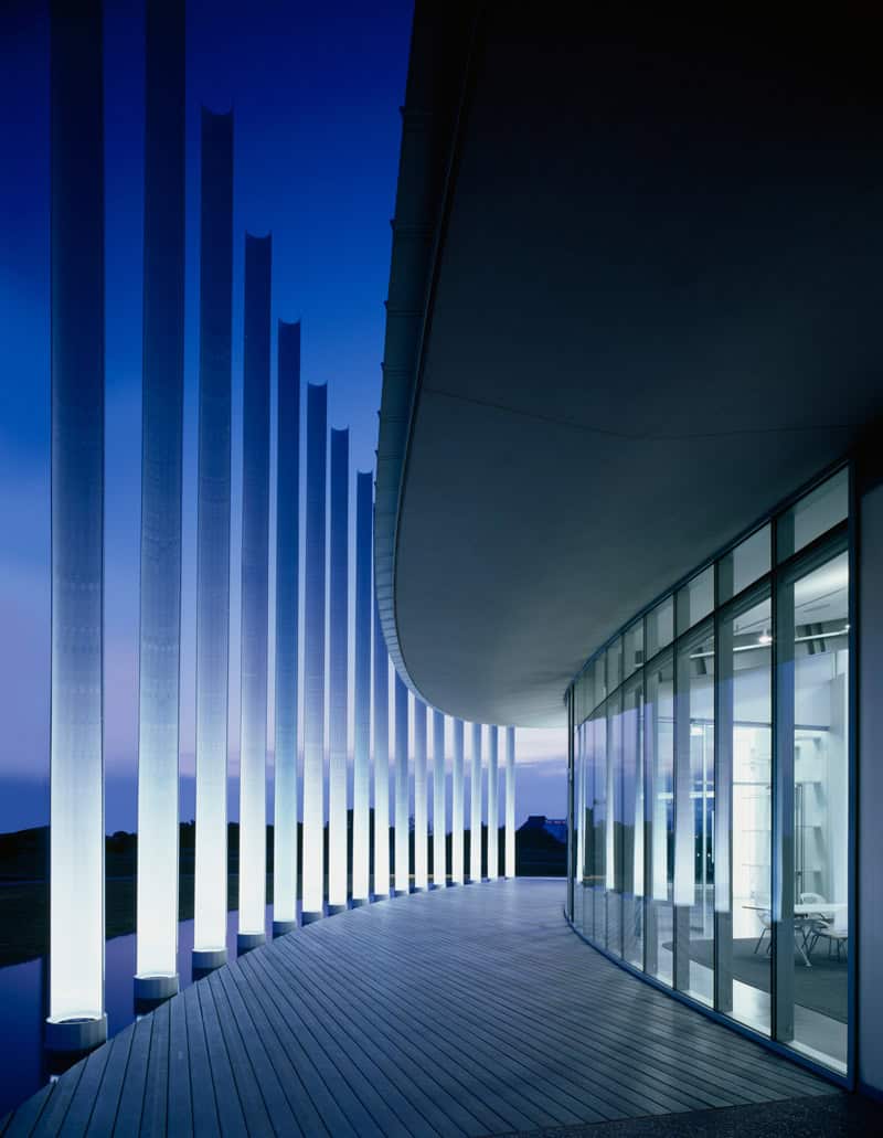 The building’s steel frame features a taut polycarbonate skin and a white standing-seam metal roof allowing the building to glow with energy as the sun sets. An outdoor deck and reflecting pool were developed to expand the functional space of the structure and to connect the boathouse, both physically and visually, to the river. Dramatic night lighting creates the illusion the building is floating above water.