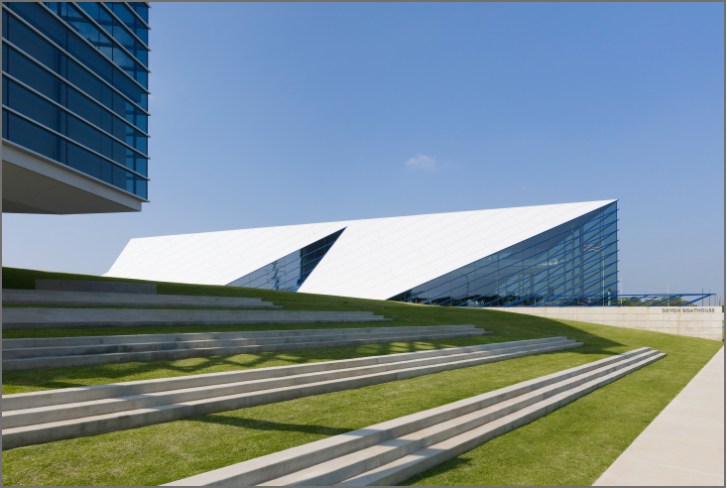 This, the second boathouse to rise from OKC’s fast-growing Boathouse District, Devon’s immaculate boathouse is twice the size of the 2006 Chesapeake Boathouse. It opened next door to the CHK Finish Line Tower all but simultaneously, as Rand Elliott Architects continued its task of designing still more sculptural structures. There was momentum to be seized.