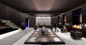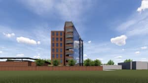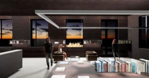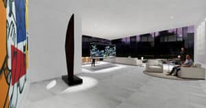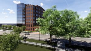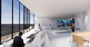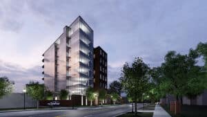Amenities for each resident were to include covered parking, a spacious courtyard, pool with waterfall and lounge area designed as Outdoor “rooms.” Along with a full-service concierge, the lobby design featured a “curated table” with items such as book titles from nearby Commonplace Bookstore. The lobby’s two-sided glass fireplace were to be visible from the courtyard.